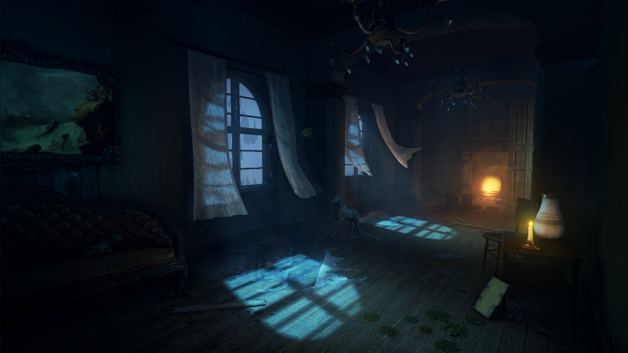 Looking good, even though its not Amnesia, it has a similar, surreal feeling to it. Assets look nice, especially the old couch. One thing I can think of, which might just be personal taste, but I think it could use a little more contrast in the lighting. I did a quick edit of the image to try to show what I mean, hope you won't mind.I darkened the room in places like the roof, and lightened the window light. The fire I made brighter too. Might be overdone, but I think the scene has more visual interest with more contrast as opposed to a more even lighting throughout. I would also be tempted to try adding more of the smaller bits of crumbled plaster/dirt on the floor, too. Nice work!
