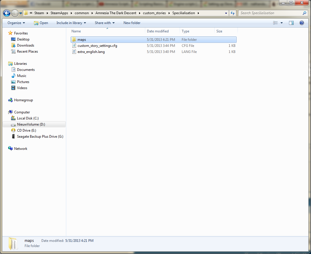(05-31-2013, 04:08 PM)Adrianis Wrote: That's great, thanks, from your description it sounds like it should be right. Would you mind posting up the content of your custom story .cfg file again? It's still saying the files specified don't exist... Could you also take a screenshot of the folder ...\Specialisation\ , and also of the ...\Specialisation\maps\ folder, and post those, so we can see the content exactly?