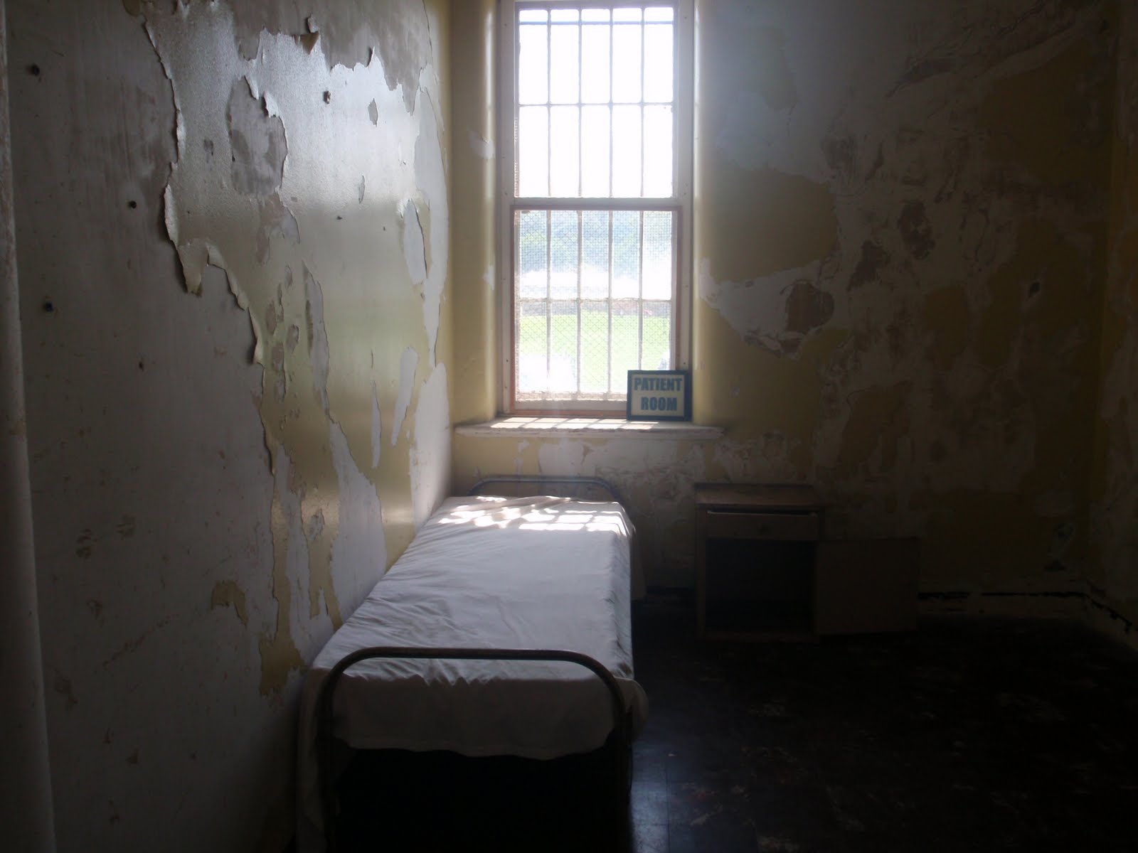 On the other hand, if it's an asylum cell, there would be no medicine, or sharp/heavy objects available (to prevent the patient from causing harm to themselves or others). The scribbling on the wall makes me think that this may be an asylum patient's room. Asylums were not designed with their patients' comfort in mind. The patient rooms tend to be small and cramped, like the one in the link.
