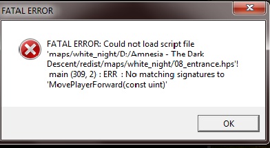Hi, I am currently playing the TC mod White Night and I am at the part where you are outside and about to enter the hospital again. The problem is that when I enter the main door everything freezes or something and the screen goes black. I then end the game and there is a error message (attatched image) on the desktop. How can I fix this? I have to finish this game