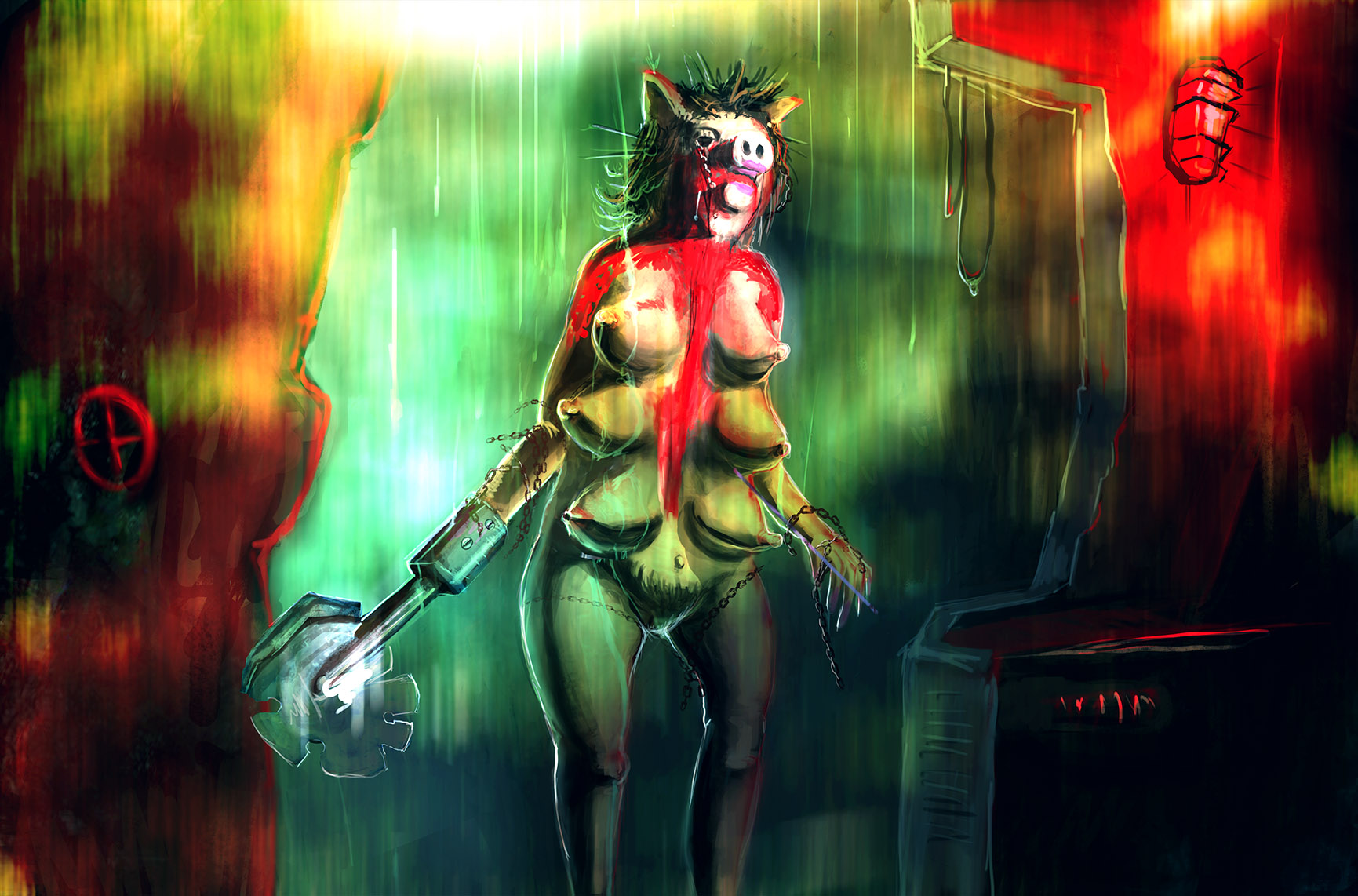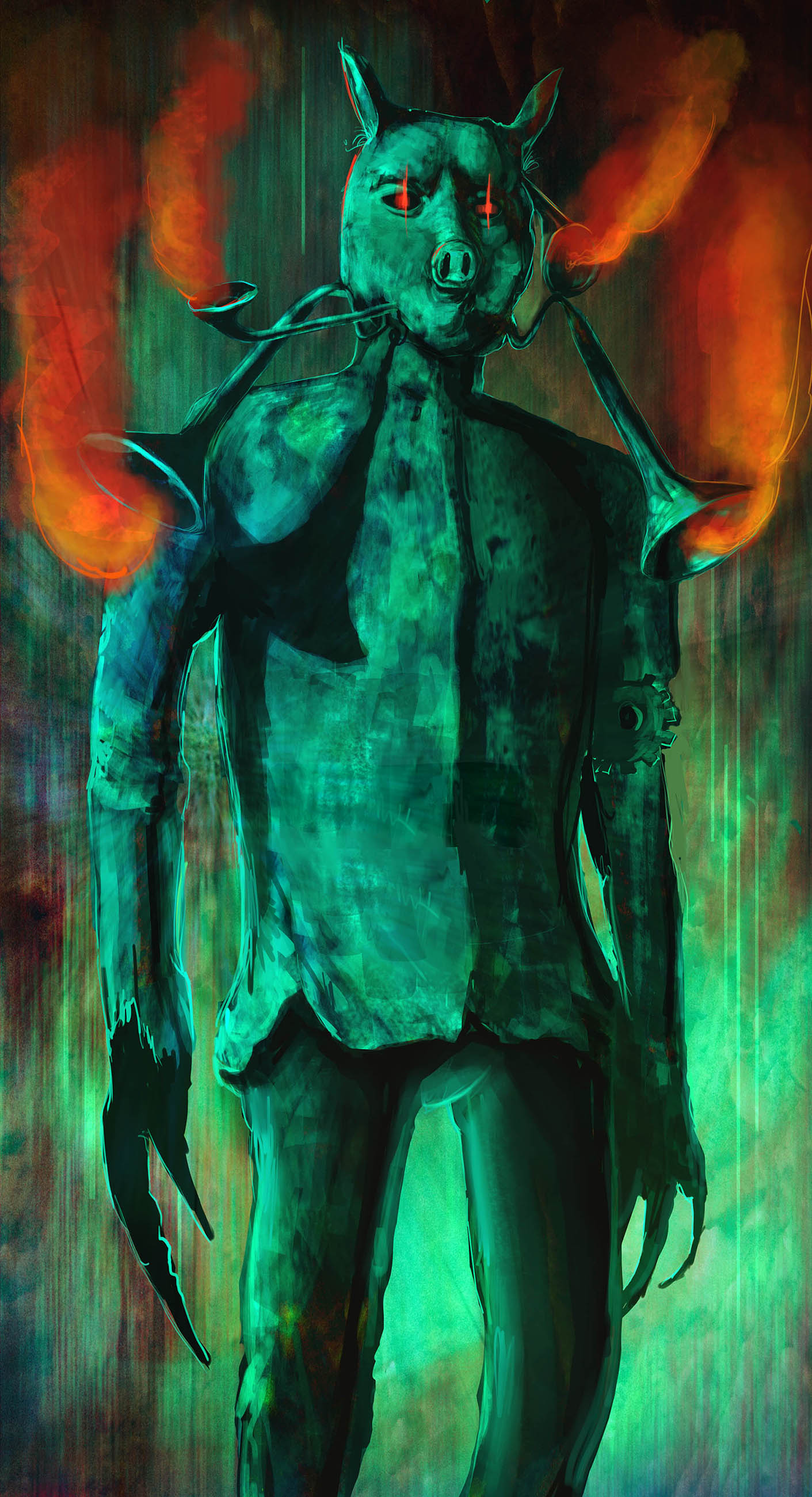 Say, how about you guys try to draw the pig monster as a hybrid of creature and machine. As if it was manufactured by the dark machine instead of it being just about a mutilated pig monster.