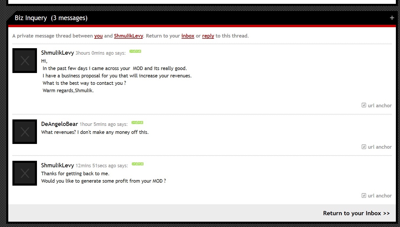 Well I googled his screen name and apparently he's some guy in israel. Also the fact that the account messaging me on ModDB was created....today. Definitely doesn't seem legit.