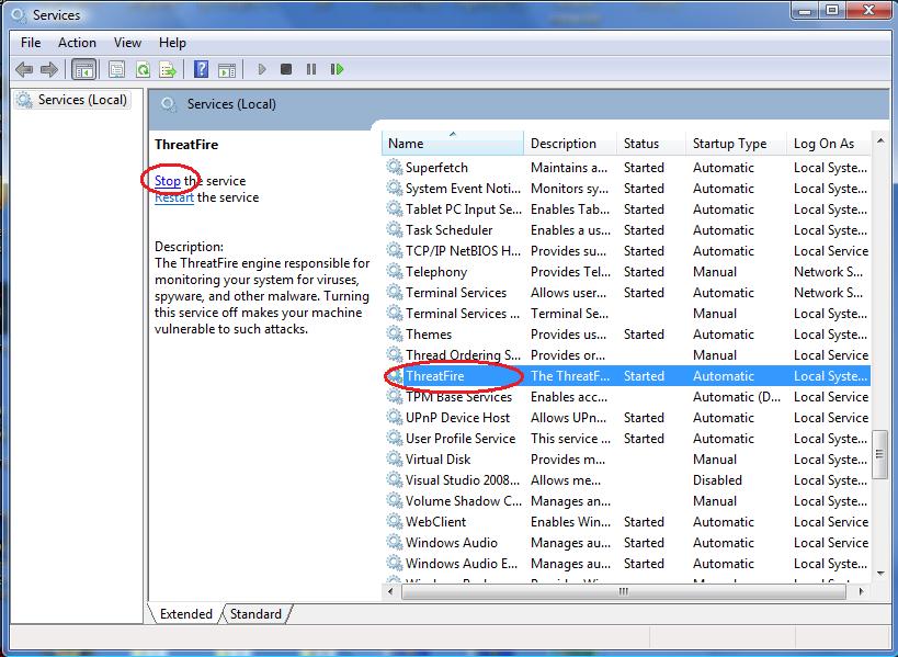 Find Threatfire, select it and click Stop in the upper left corner. (see screenshots)