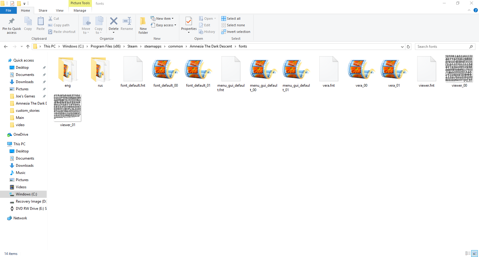 "ERROR: Could not open file C:/Program Files (x86)/Steam/steamapps/common/Amnesia The Dark Descent/fonts/game_default_0.dds for reading!